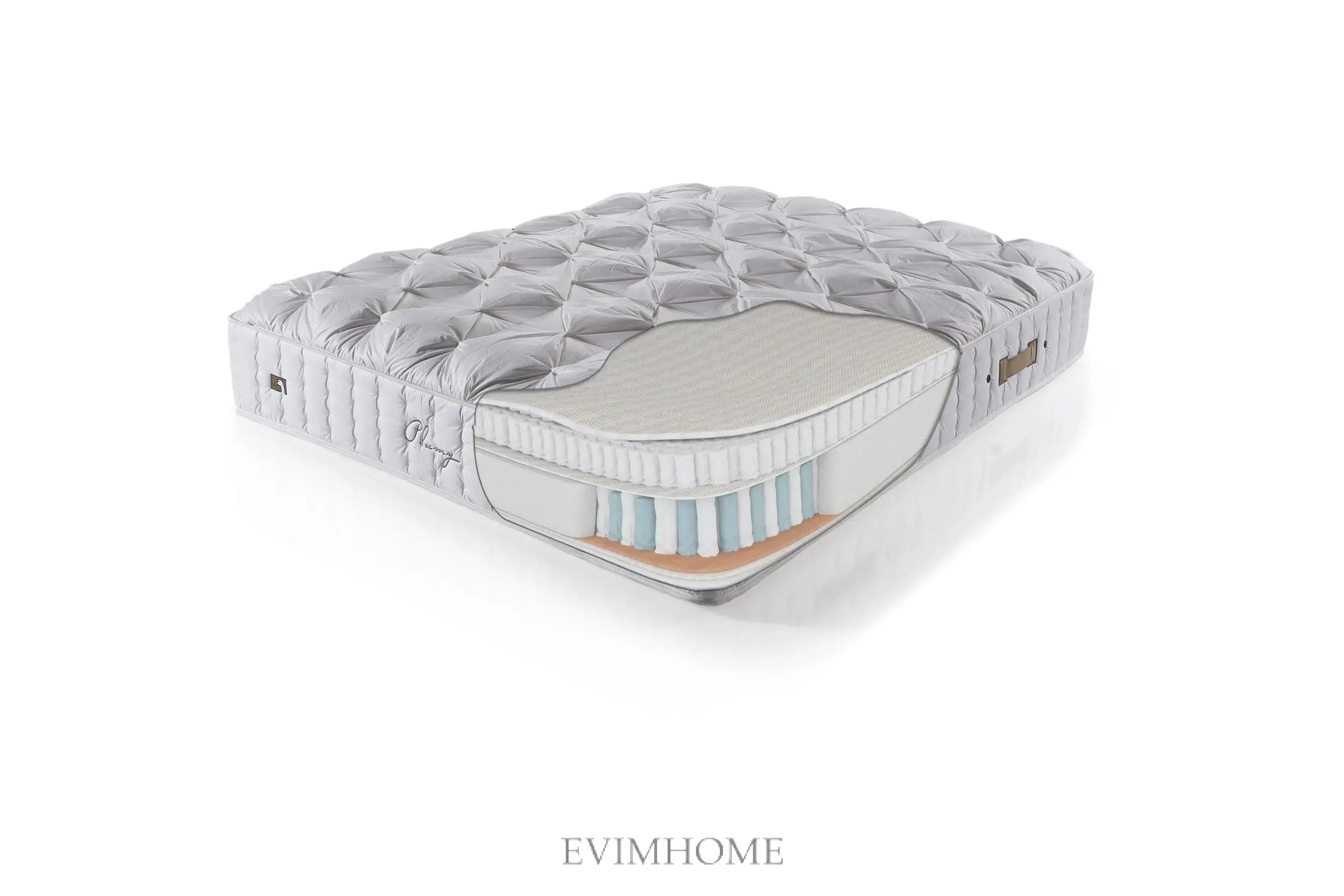 Jede Matratze wird in einem aufwendigen, handgefertigten Prozess hergestellt, bei dem jede Zelle individuell genäht wird, um eine optimale Luftzirkulation zu ermöglichen. Jede Zelle enthält eine gleichmäßige Menge an Gänsefedern, die die Atmungsaktivität und den Komfort weiter steigern.