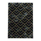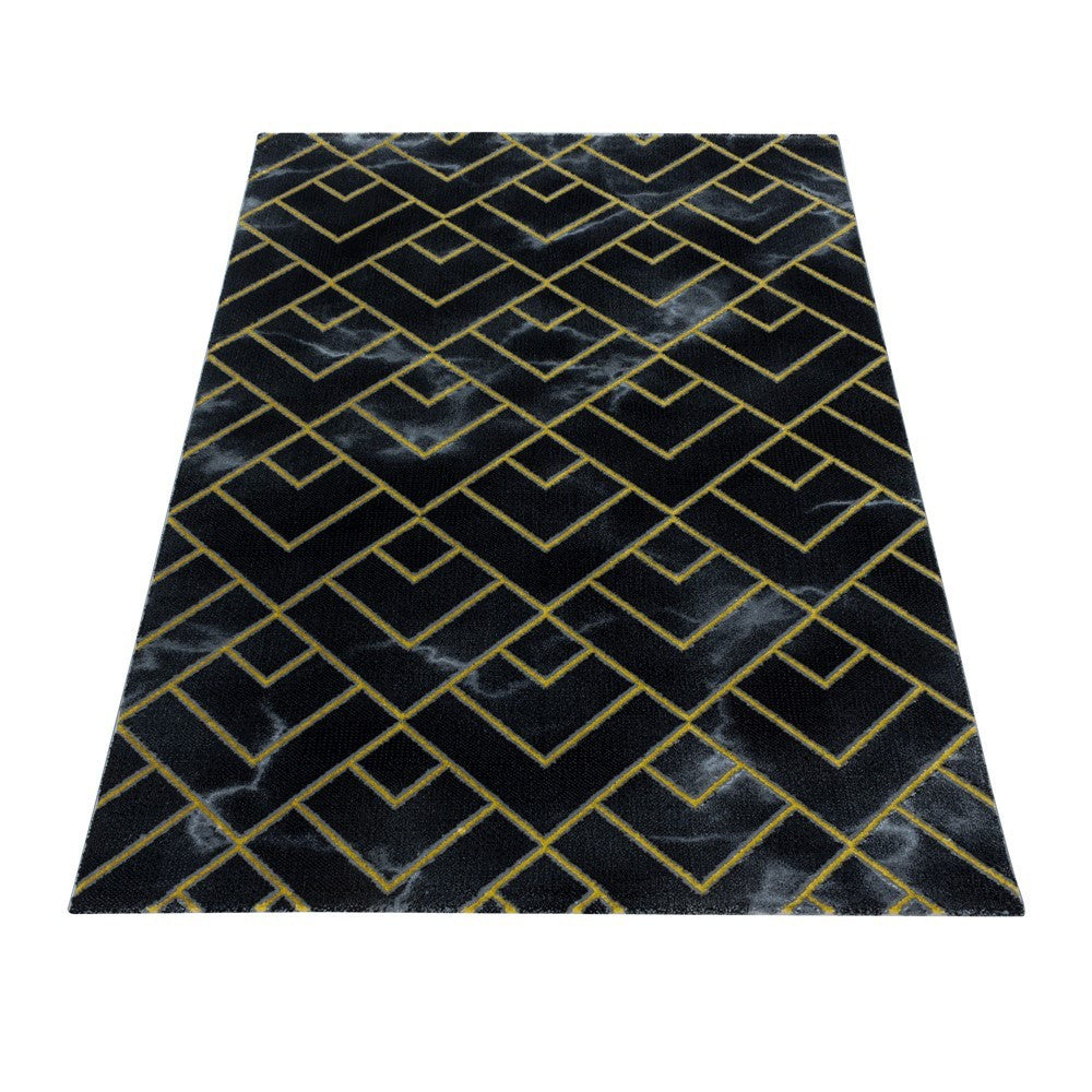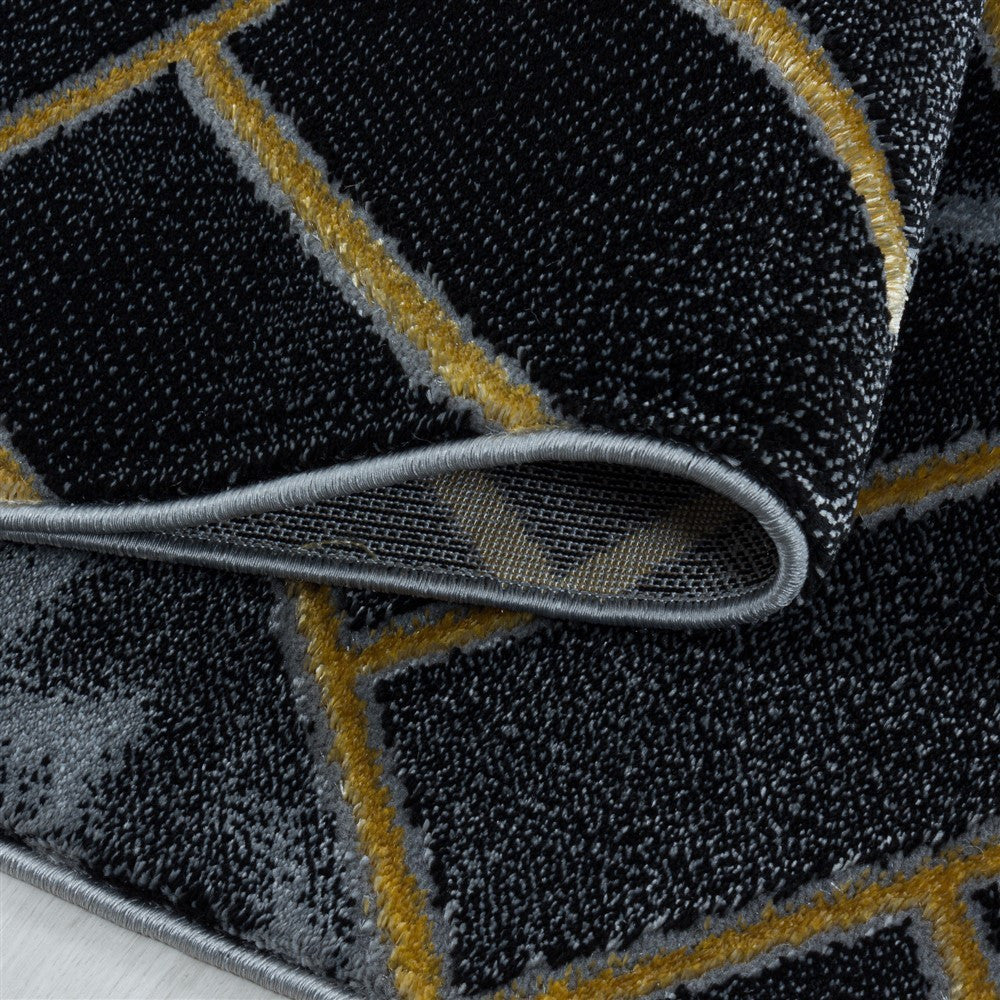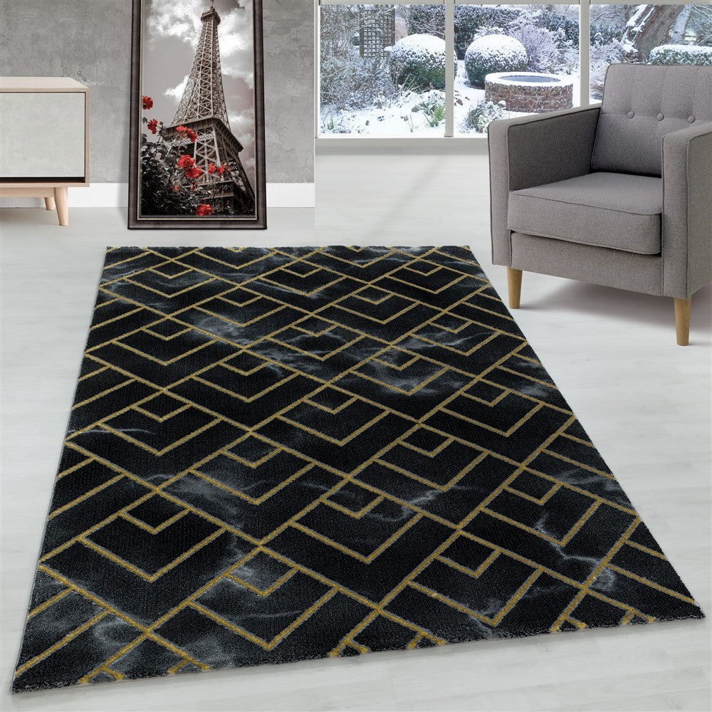 Wohnzimmerteppich Kurzflor Teppich Dunkel Marmoriert Linien Karo Gold