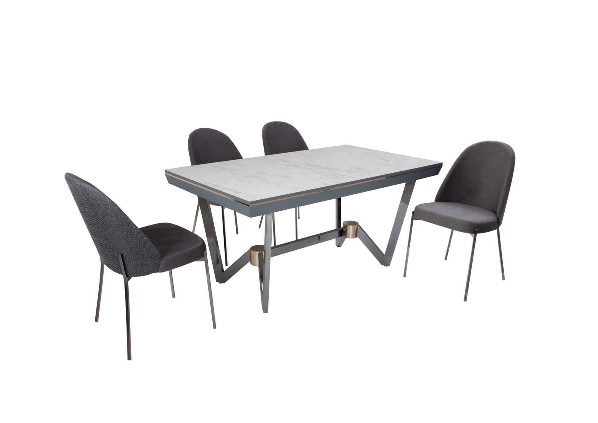 Der Esstisch in edlem Rauchgrau überzeugt mit seiner hochwertigen Oberfläche, die nicht nur optisch Akzente setzt, sondern auch besonders widerstandsfähig und pflegeleicht ist. Ergänzt wird der Tisch durch die passenden Stühle mit stabilem Metallgestell, die modernes Design mit hohem Sitzkomfort verbinden. Das Gestell sorgt für sicheren Stand und unterstreicht den luxuriösen Charakter des Sets.