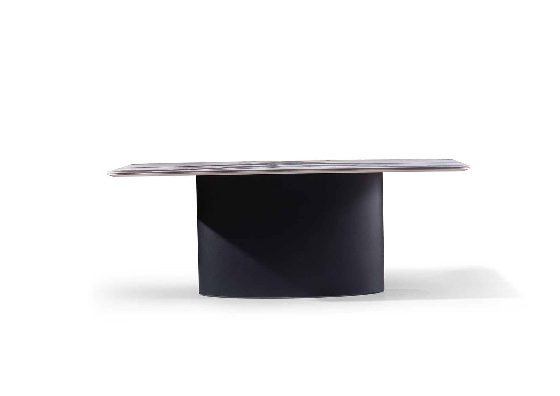 The Nevada dining table embodies powerful, exclusive design and exceptionally solid construction. The generously sized tabletop with its striking marble look rests on a wide, block-like central pedestal, giving the table a monumental yet elegant appearance.