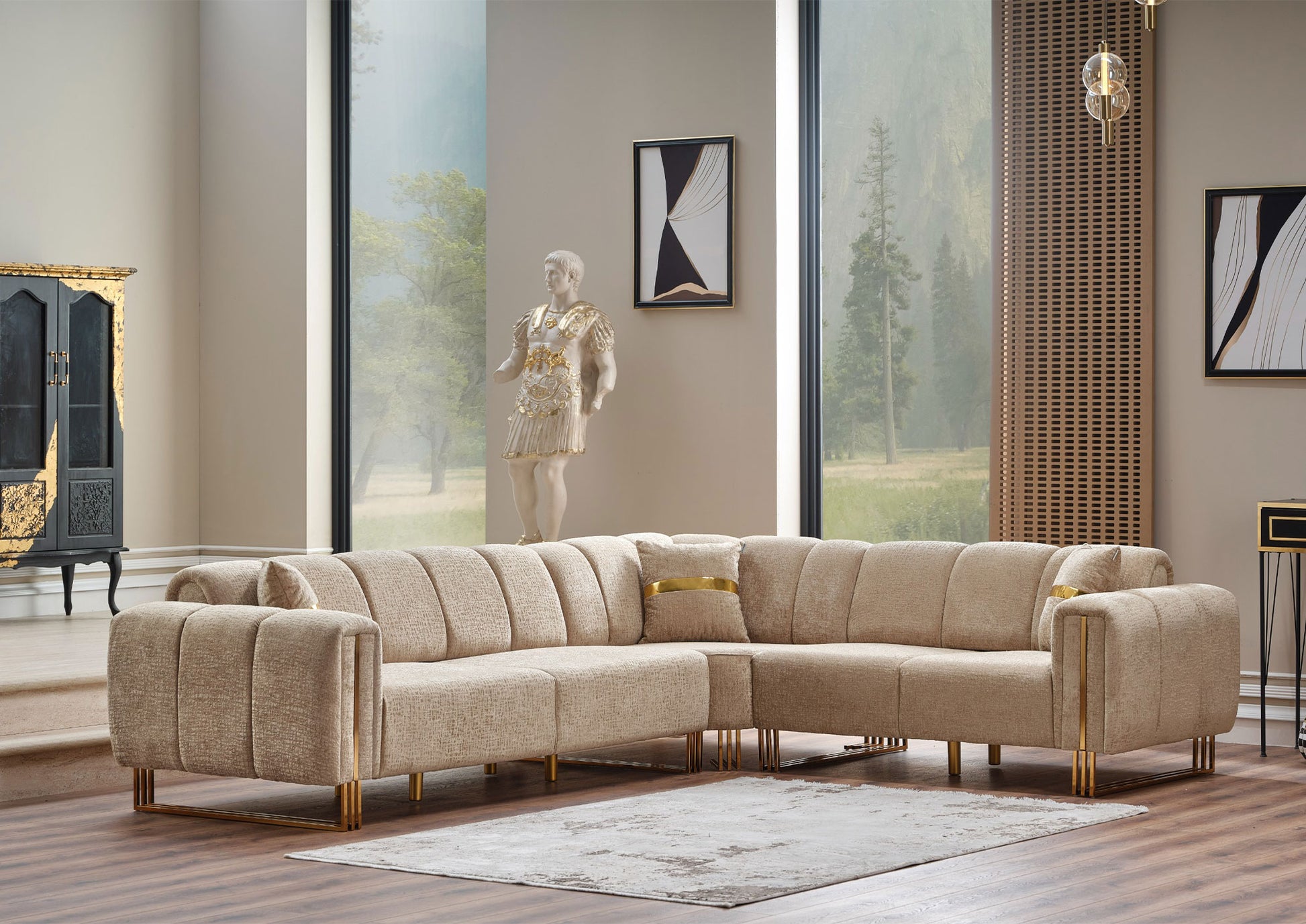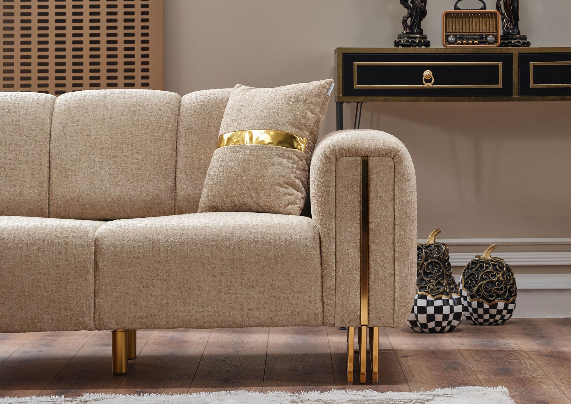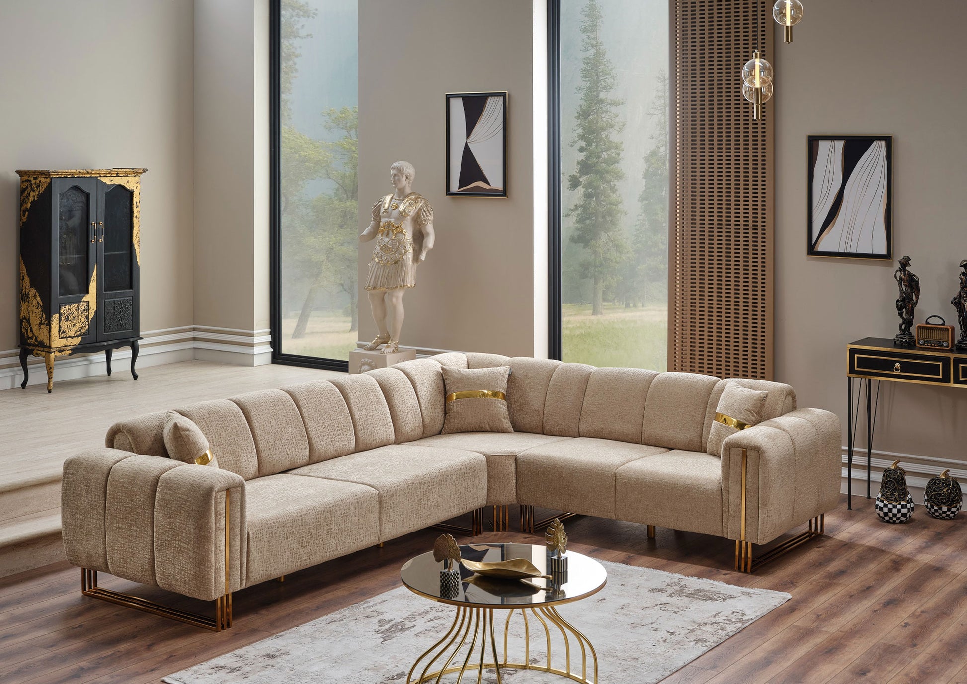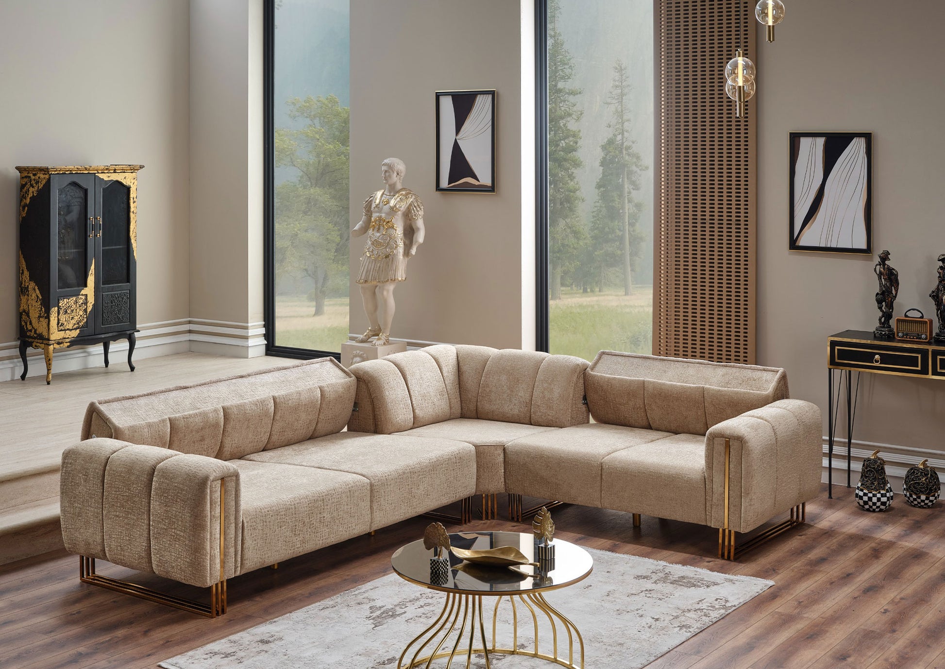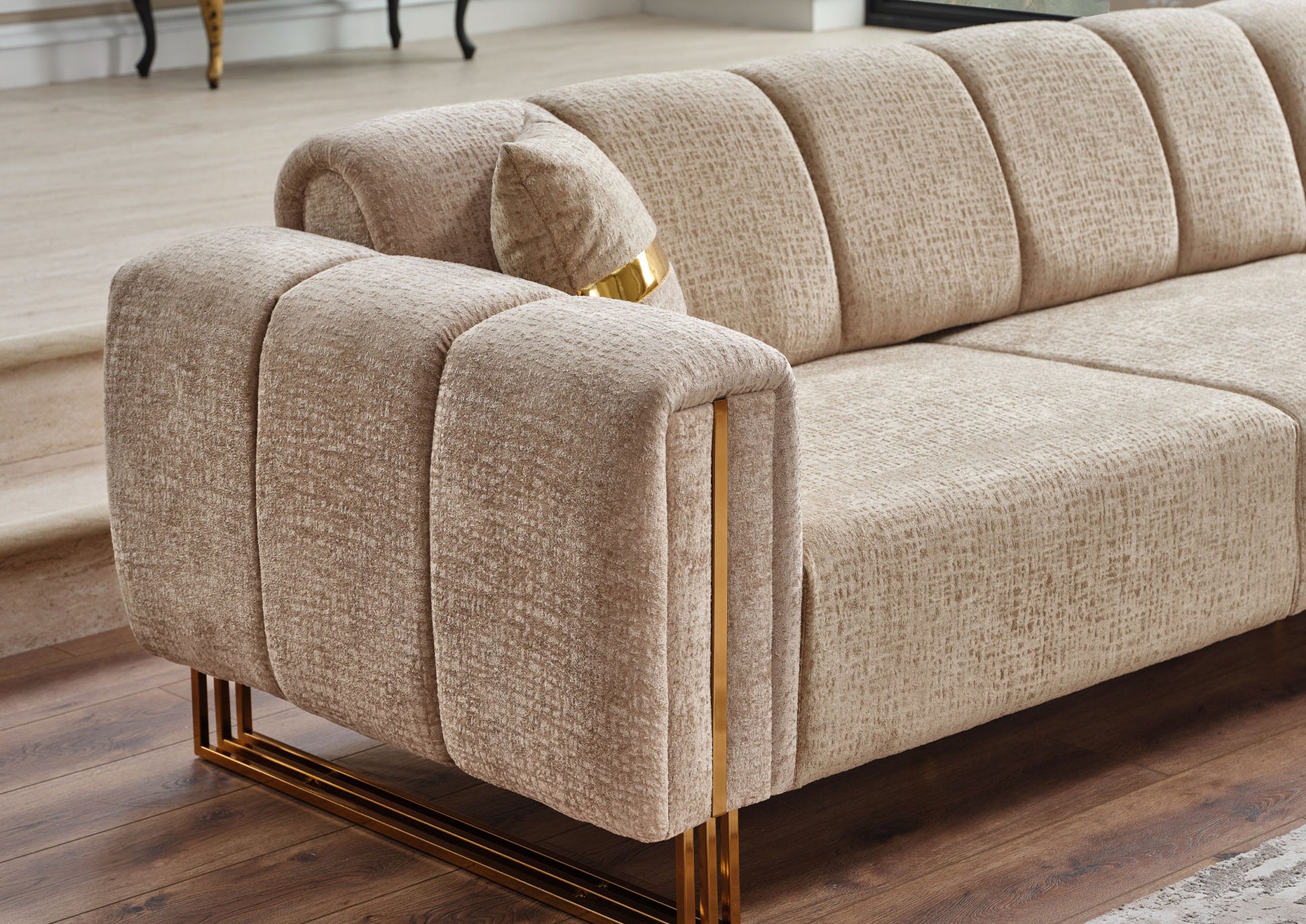 Die OTTO Eckgarnitur vereint luxuriöse Optik mit einem modernen, harmonischen Design. Die weich gepolsterte Oberfläche mit breiten, vertikal abgesteppten Elementen verleiht dem Sofa einen hochwertigen Charakter, während die goldfarbenen Designdetails an den Füßen und Armlehnen für einen exklusiven Look sorgen.