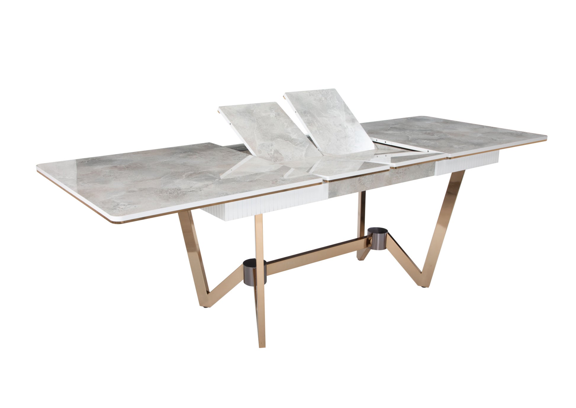 Der lackierte Esstisch überzeugt mit seiner edel glänzenden Oberfläche, die nicht nur optisch Akzente setzt, sondern auch besonders widerstandsfähig und pflegeleicht ist. Ergänzt wird der Tisch durch die passenden Stühle mit stabilem Metallgestell, die modernes Design mit hohem Sitzkomfort verbinden. Das Gestell sorgt für einen sicheren Stand und unterstreicht die hochwertige Optik des Sets.