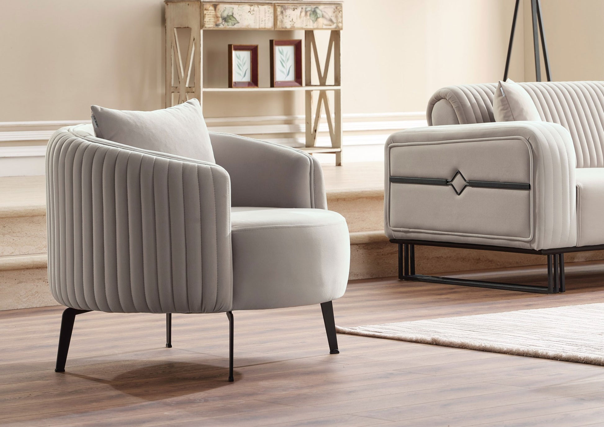 Die PETRA Sofagarnitur vereint moderne Eleganz mit klarer Formgebung. Die fein vertikal abgesteppten Rücken- und Seitenflächen verleihen den Sofas eine edle Struktur, während die schlanken Metallfüße für ein leichtes, luftiges Erscheinungsbild sorgen.