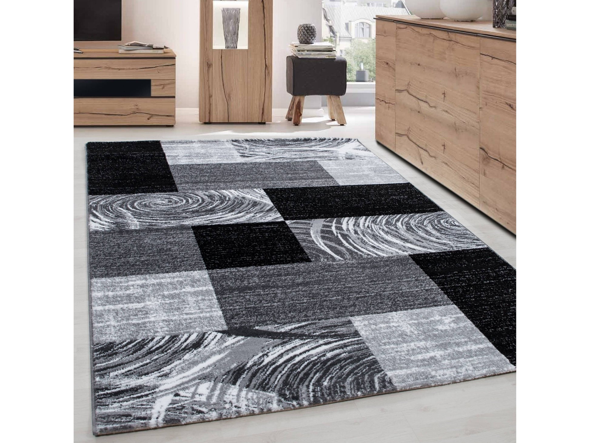 - Teppich Modern Designer Wohnzimmer Geometrisch Kariert Muster Schwarz Grau Weiss