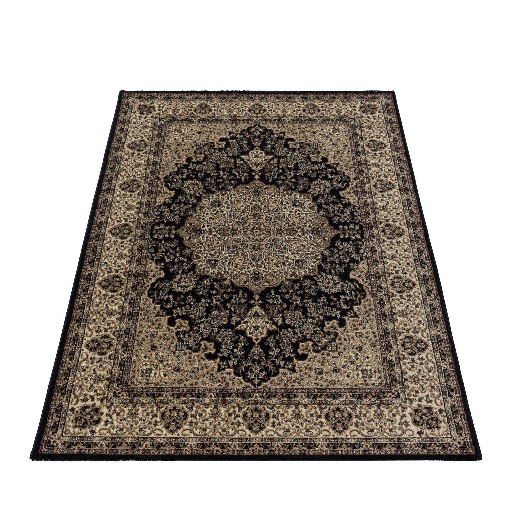 59 % Polypropylene, 28 % Jute, 7 % Polyester, 6 % Latex 100 % PP. Heatset, Florhöhe: 9 mm, 320.000 Points, 2000 gr (±%5)M2, Rücken aus Jute Klassische & Orientteppiche, Orientalisch Design, Farbe Schwarz, Teppich für Wohnzimmer, Rücken aus Jute