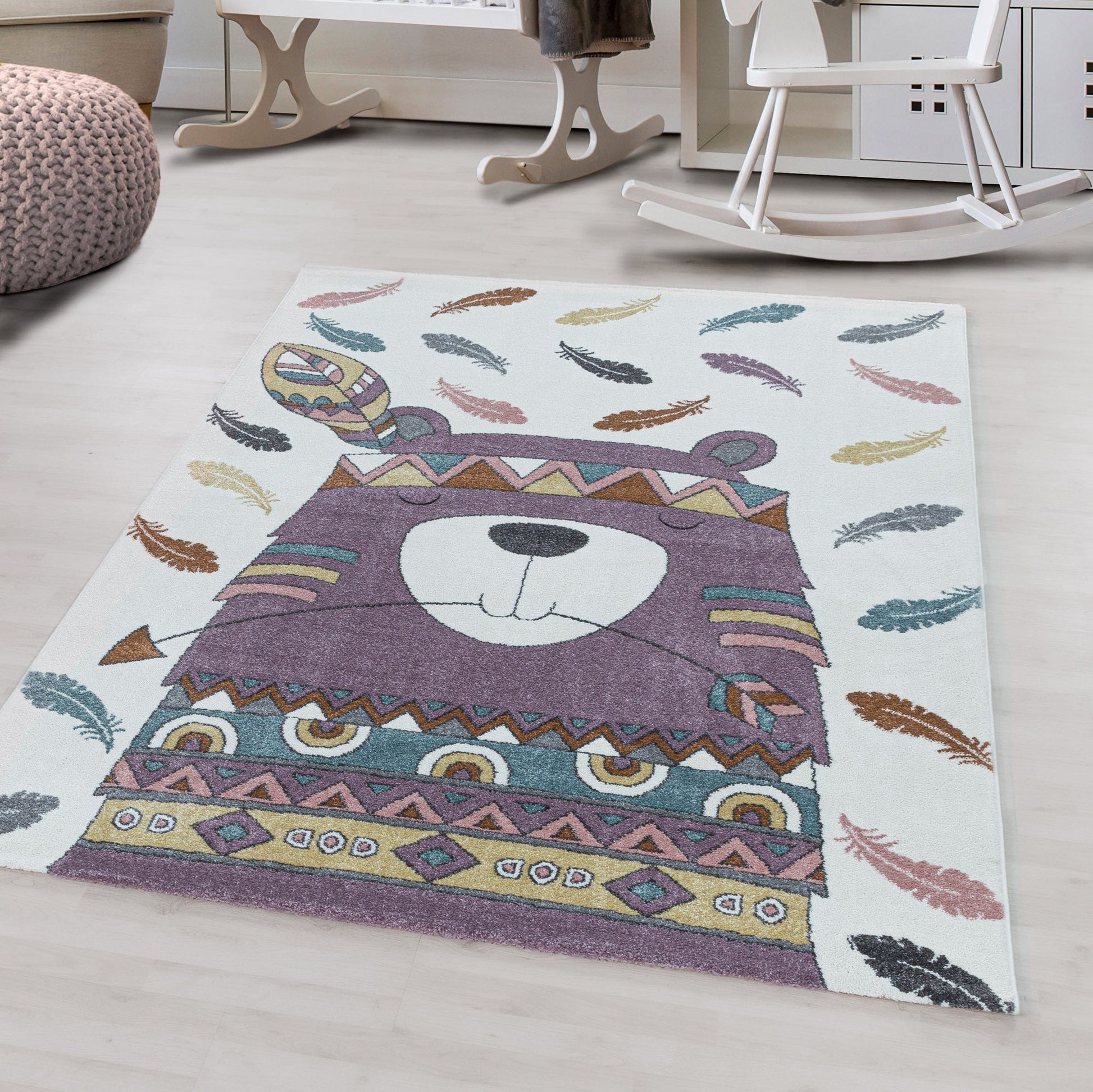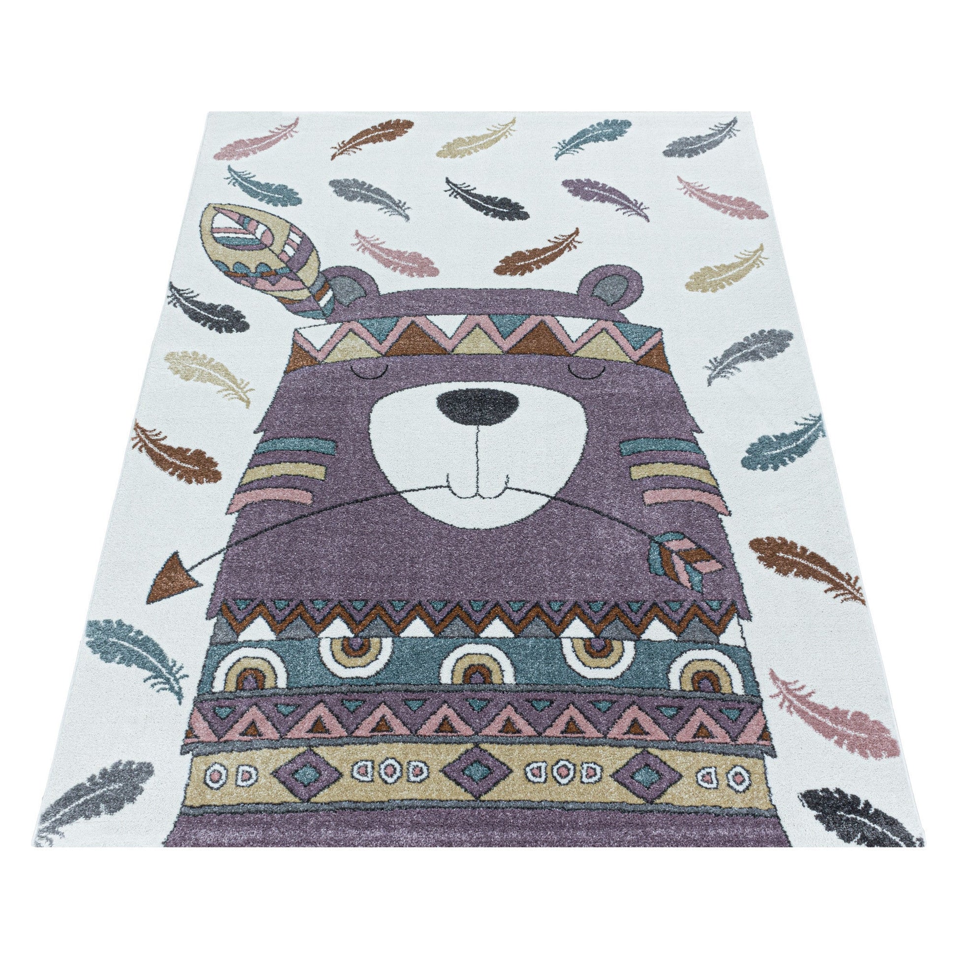Kurzflor Kinderteppich Design Indianer Bär Feder Kinderzimmer Teppich Violet