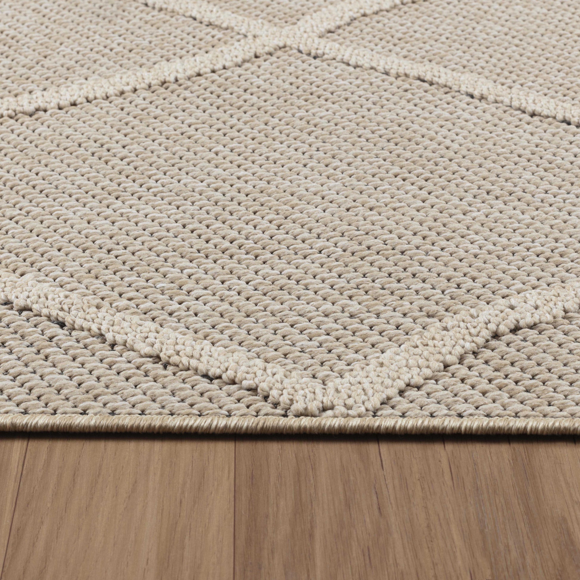 68 % Polypropylene, 19 % Jute, 5 % Polyester, 8 % Latex 100 % Polypropylen, Florhöhe: 8 mm, 1400 gr (±%5)M2, Rücken aus Polypropylen Outdoorteppiche, Boho design, Farbe Beige, Teppich für Terasse-Balkon-Küche, Rücken aus Polypropylen