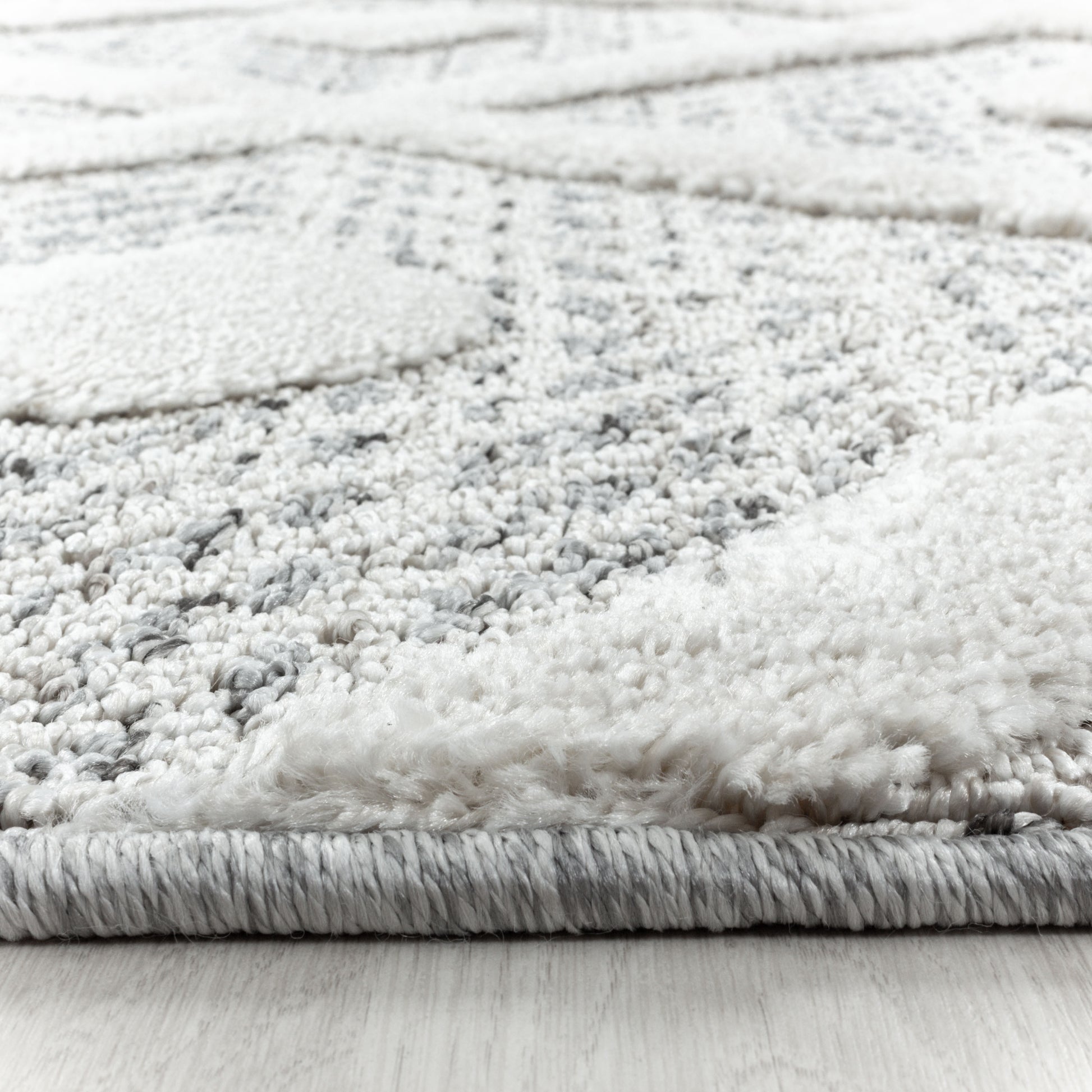 60 % Polypropylene, 30 % Jute, 5 % Polyester, 5 % Latex 100 % Polypropylen, 10 mm Cutloop und Florhöhe: 20 mm, 92.800 Points, 2150 gr (±%5)M2, Rücken aus Jute Hochflorteppiche, Geometrisch Design, Farbe Grau, Teppich für Wohnzimmer, Rücken aus Jute