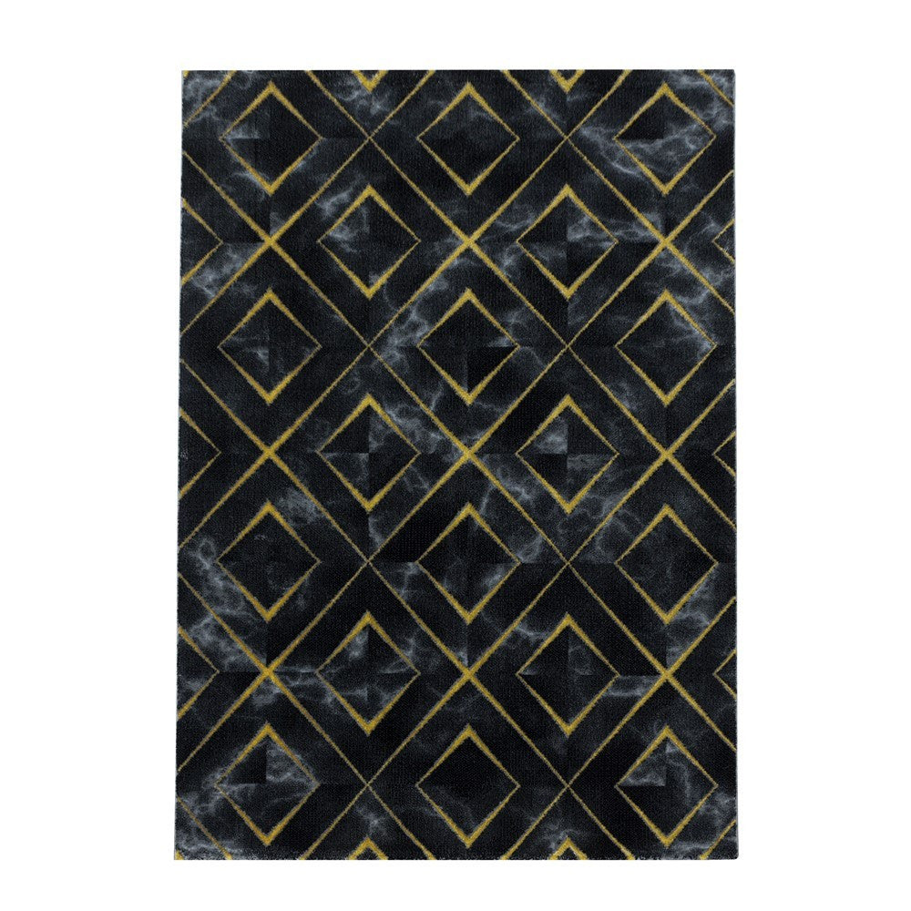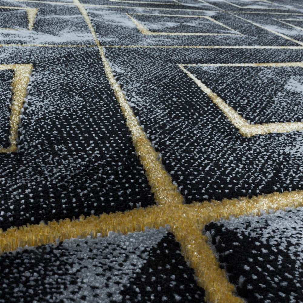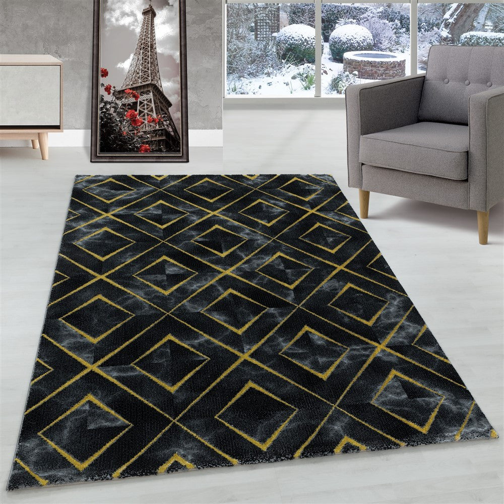 Wohnzimmerteppich Kurzflor Teppich Dunkel Marmoriert Rauten Karo Gold