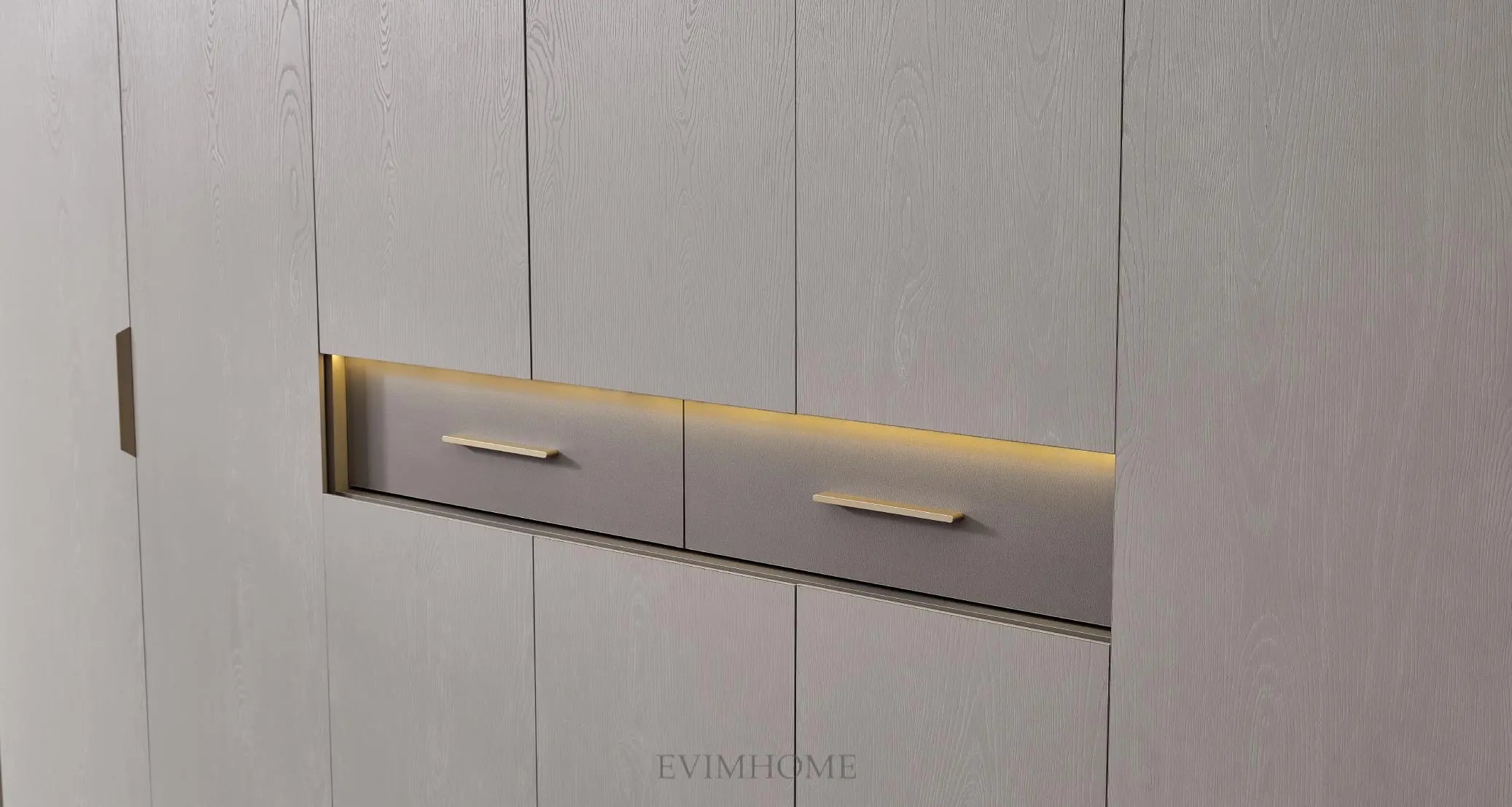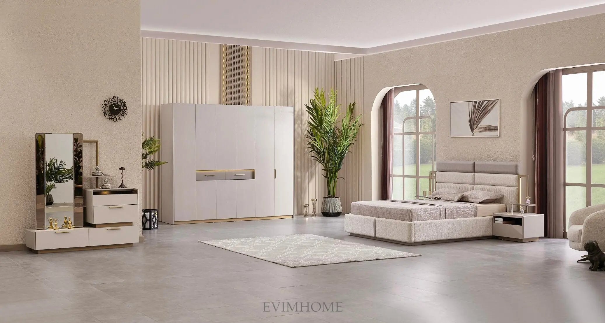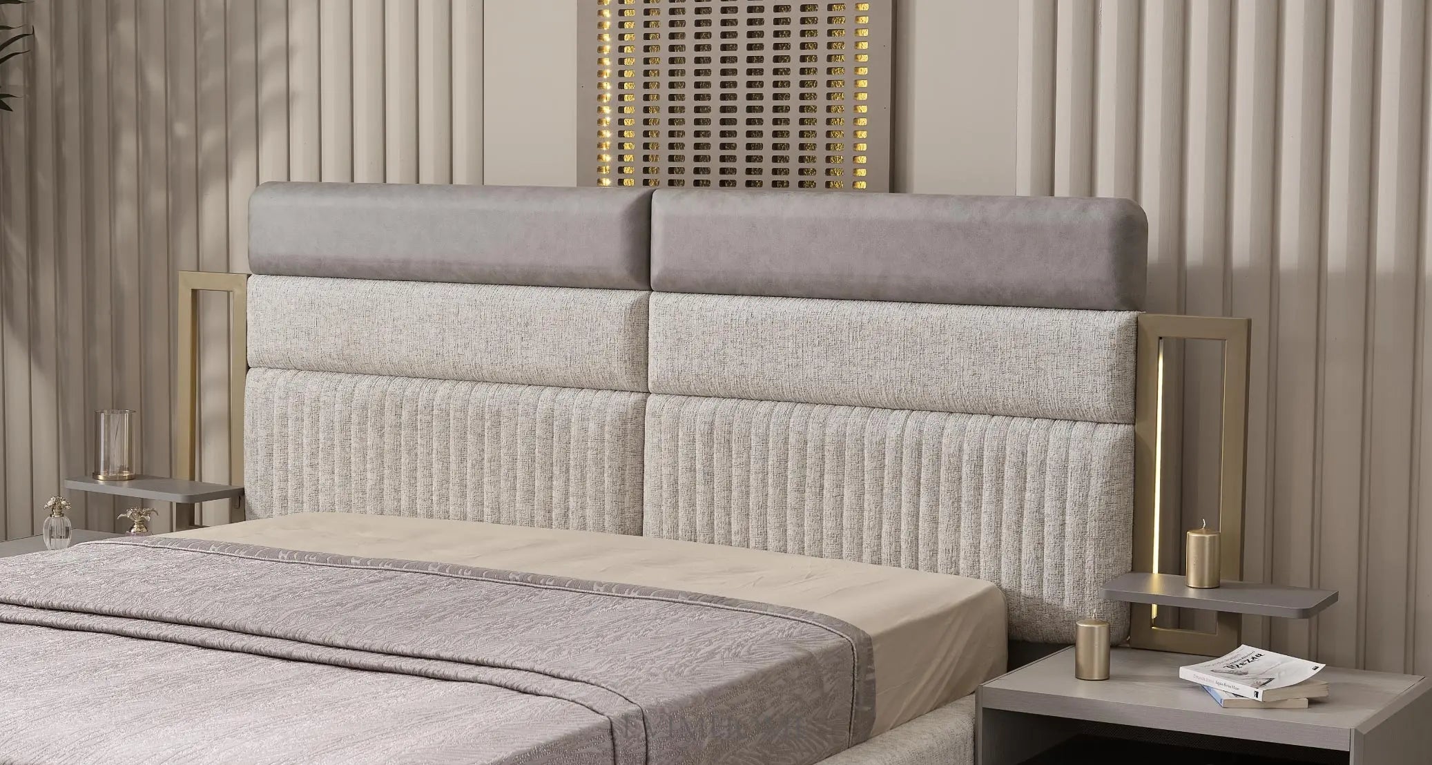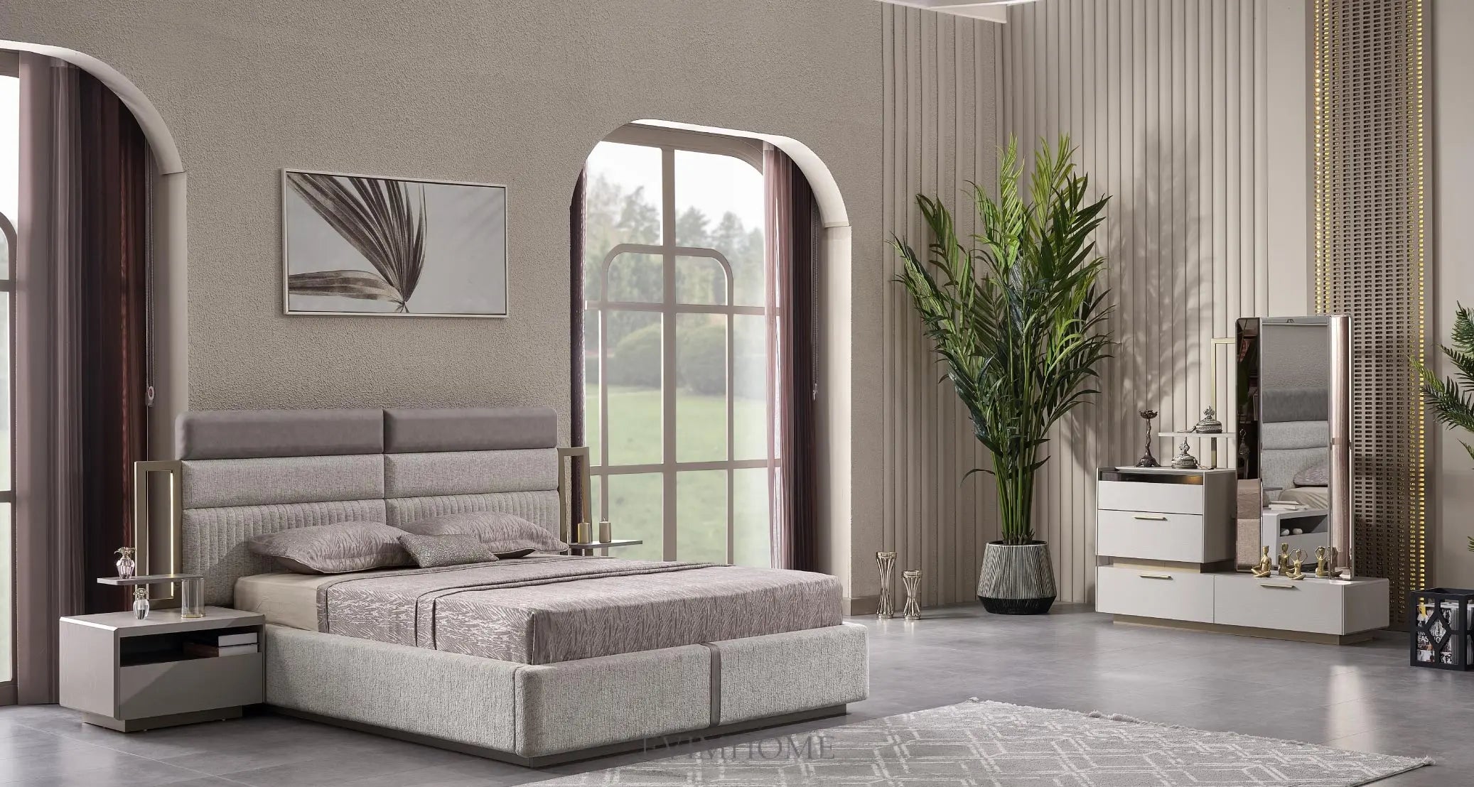 Das Kopfteil sorgt für eine ruhige und zugleich kraftvolle Ausstrahlung, während die goldfarbenen Metallfüße die raffinierte Ästhetik des Sets betonen. Mit seinen funktionalen Eigenschaften und seiner edlen Optik schafft das Napoli Schlafzimmer Set eine exklusive Schlafumgebung.