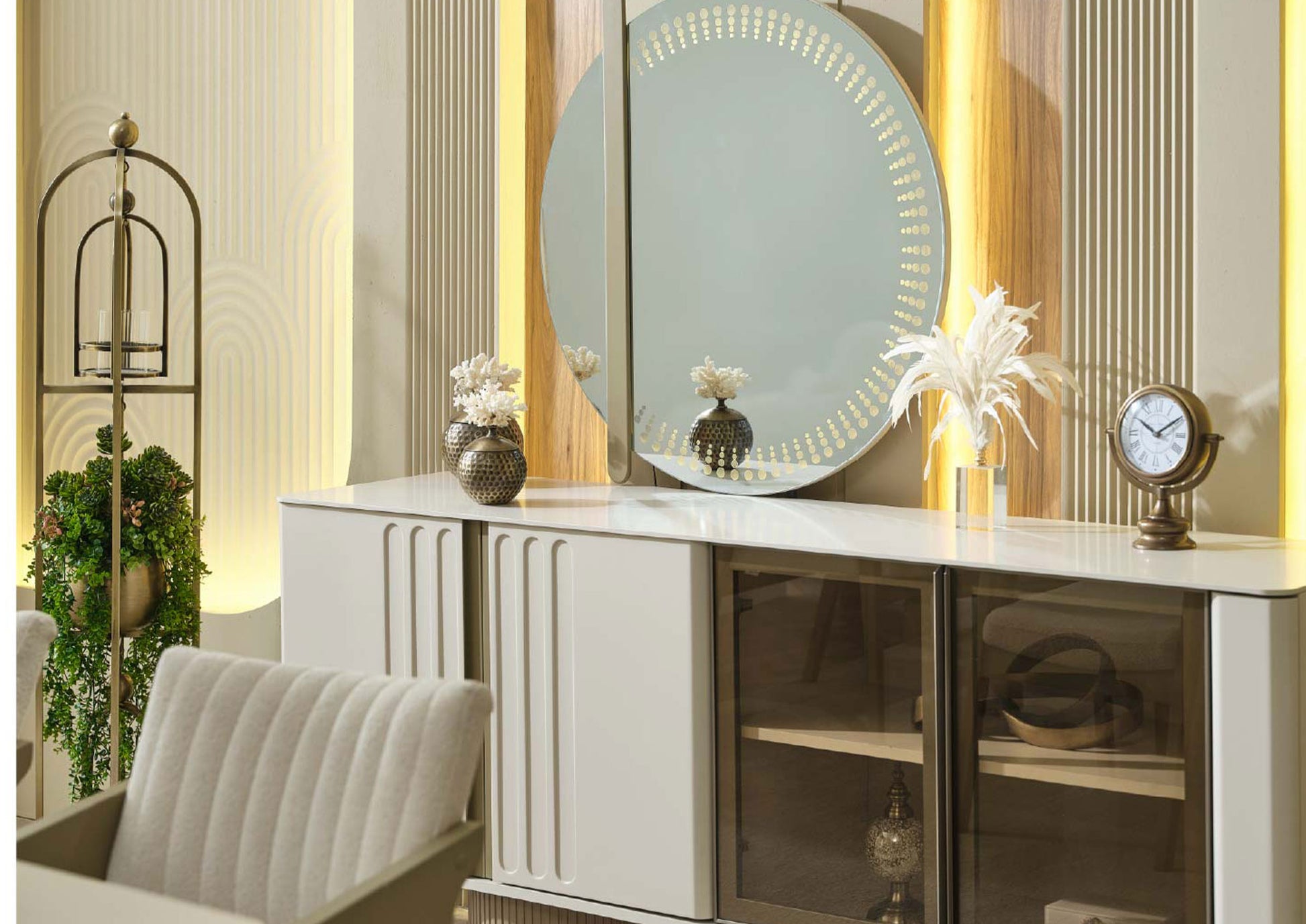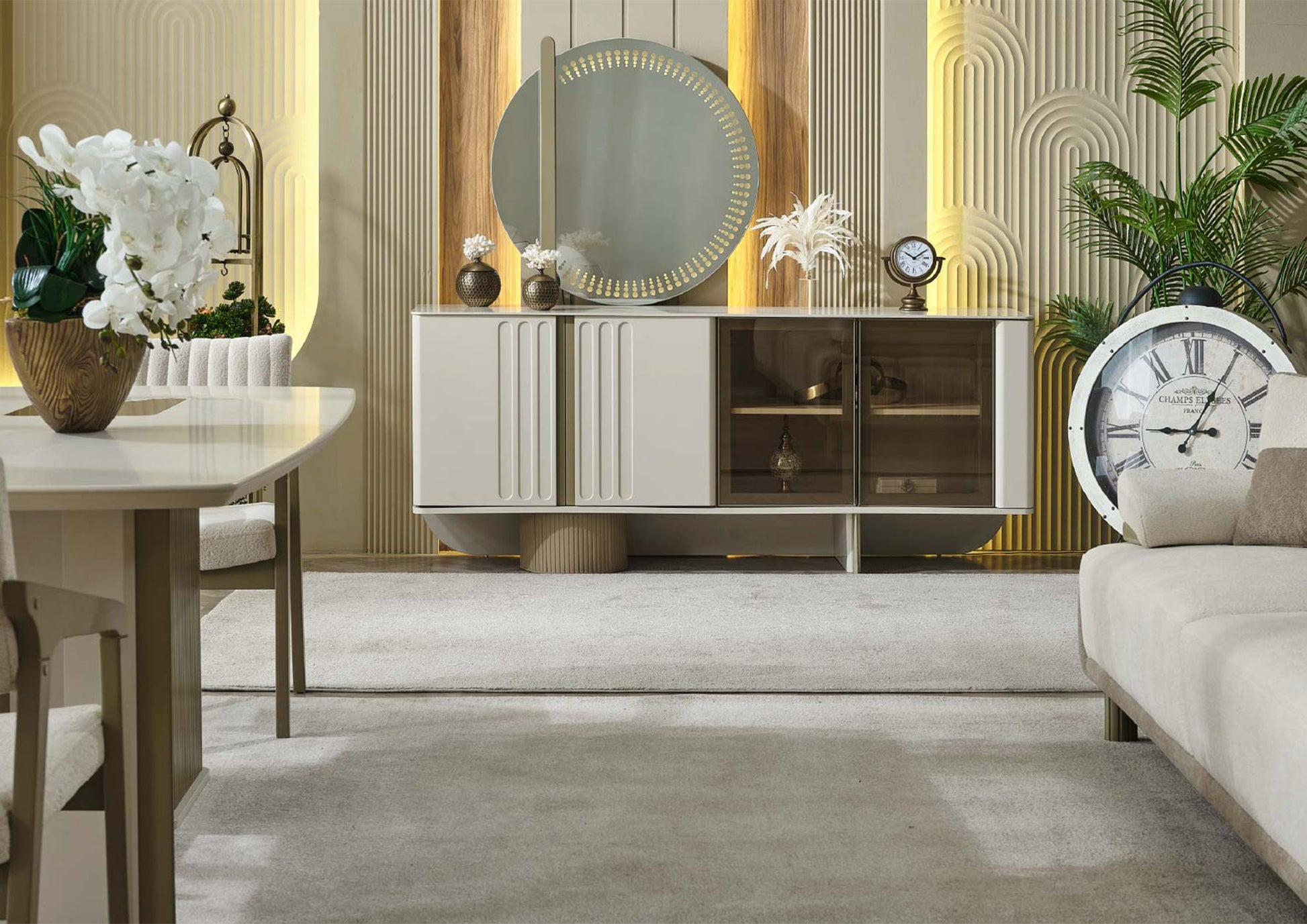 Der großzügige Esstisch, das elegante Sideboard, die moderne TV-Einheit und der praktische Couchtisch bieten sowohl optische Harmonie als auch durchdachte Nutzungsmöglichkeiten. Die Serie verbindet Ästhetik mit Komfort und macht Ihren Essbereich zu einem echten Highlight Ihres Zuhauses.
