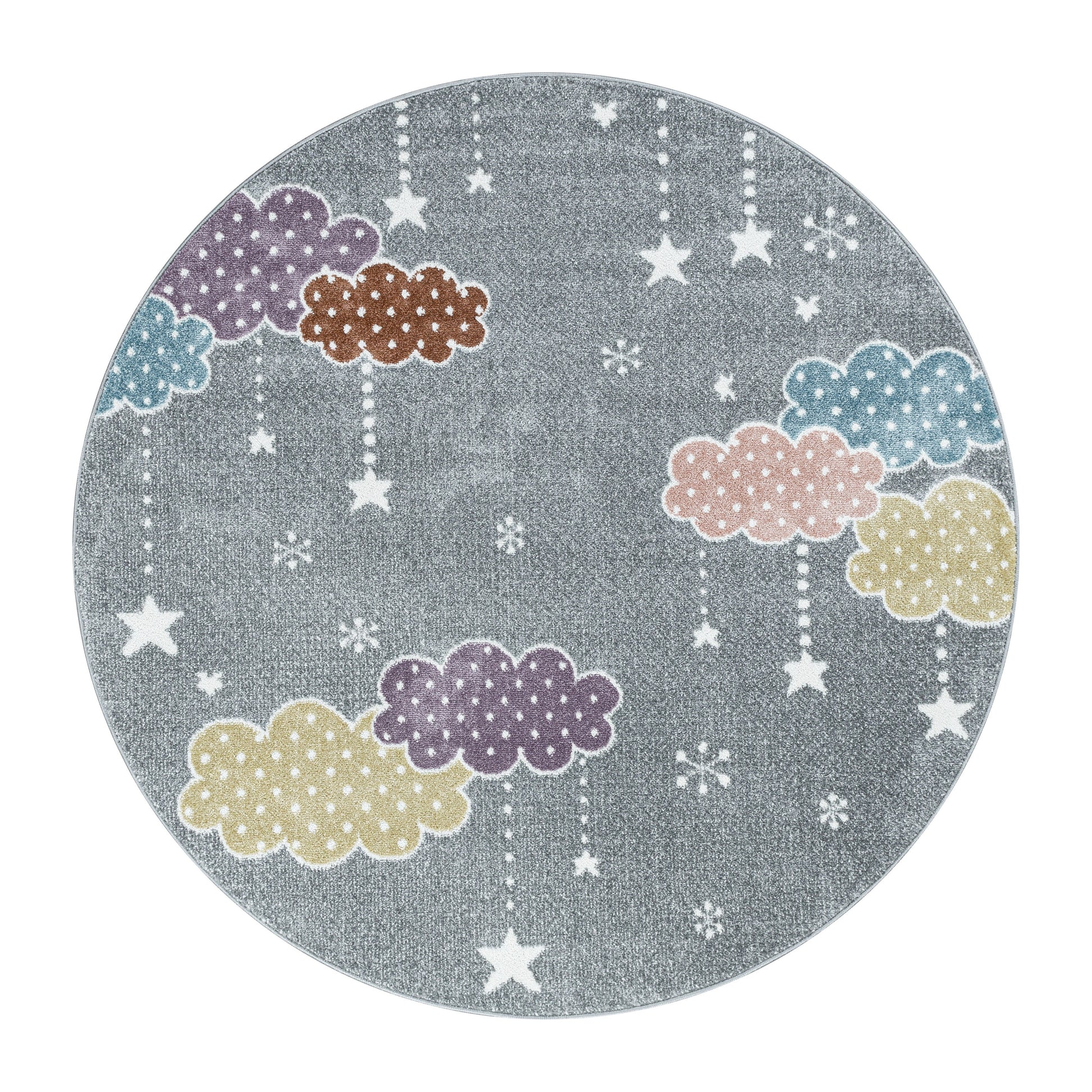 Kinderteppich Kurzflor Teppich Kinderzimmer Bunte Wolken Sterne Weich Grau