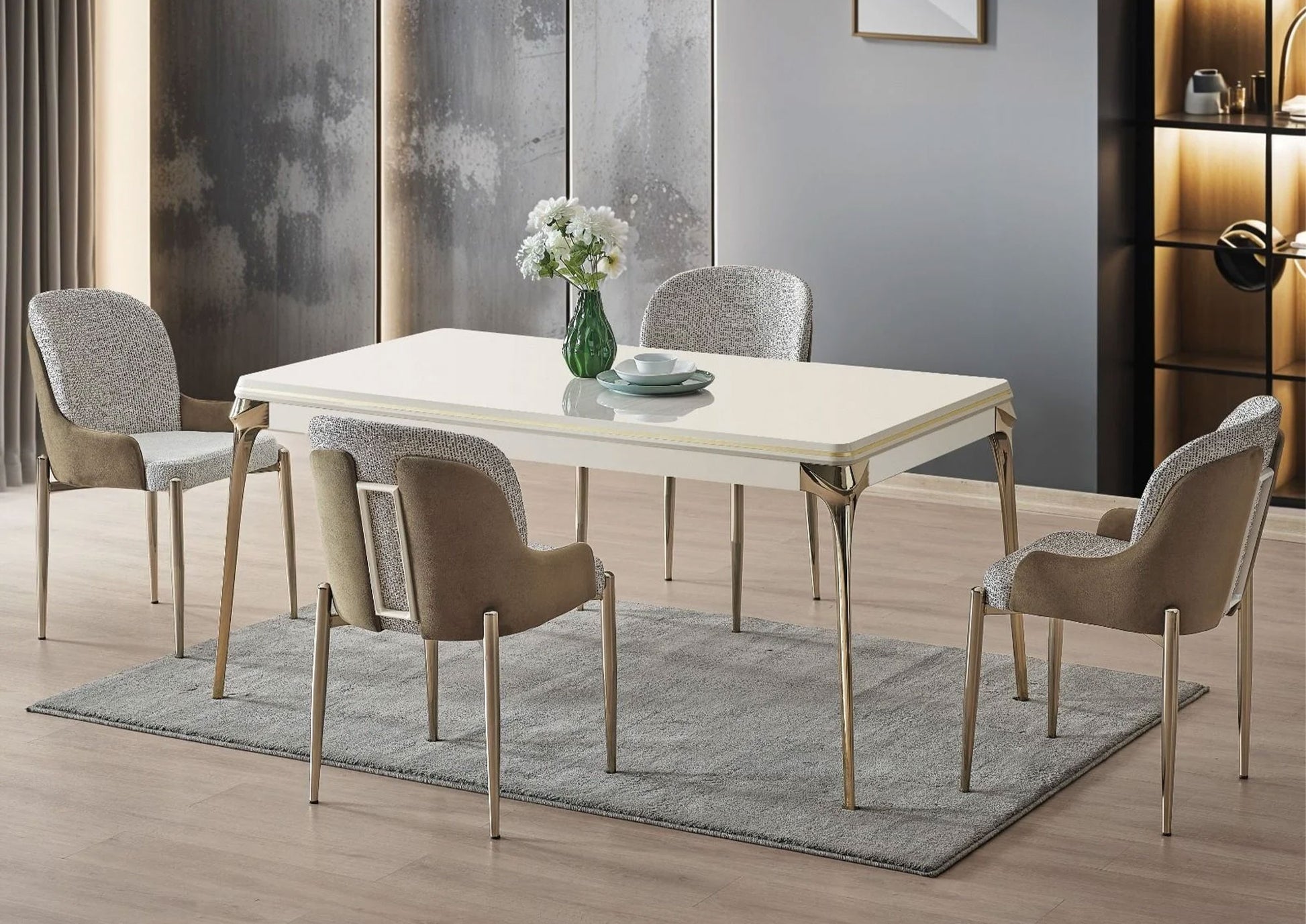 Mit dem ELVİN Esstisch-Set Gold schaffen Sie einen Essbereich, der Eleganz, Komfort und Alltagstauglichkeit perfekt miteinander verbindet – ein Blickfang für jedes Zuhause.
